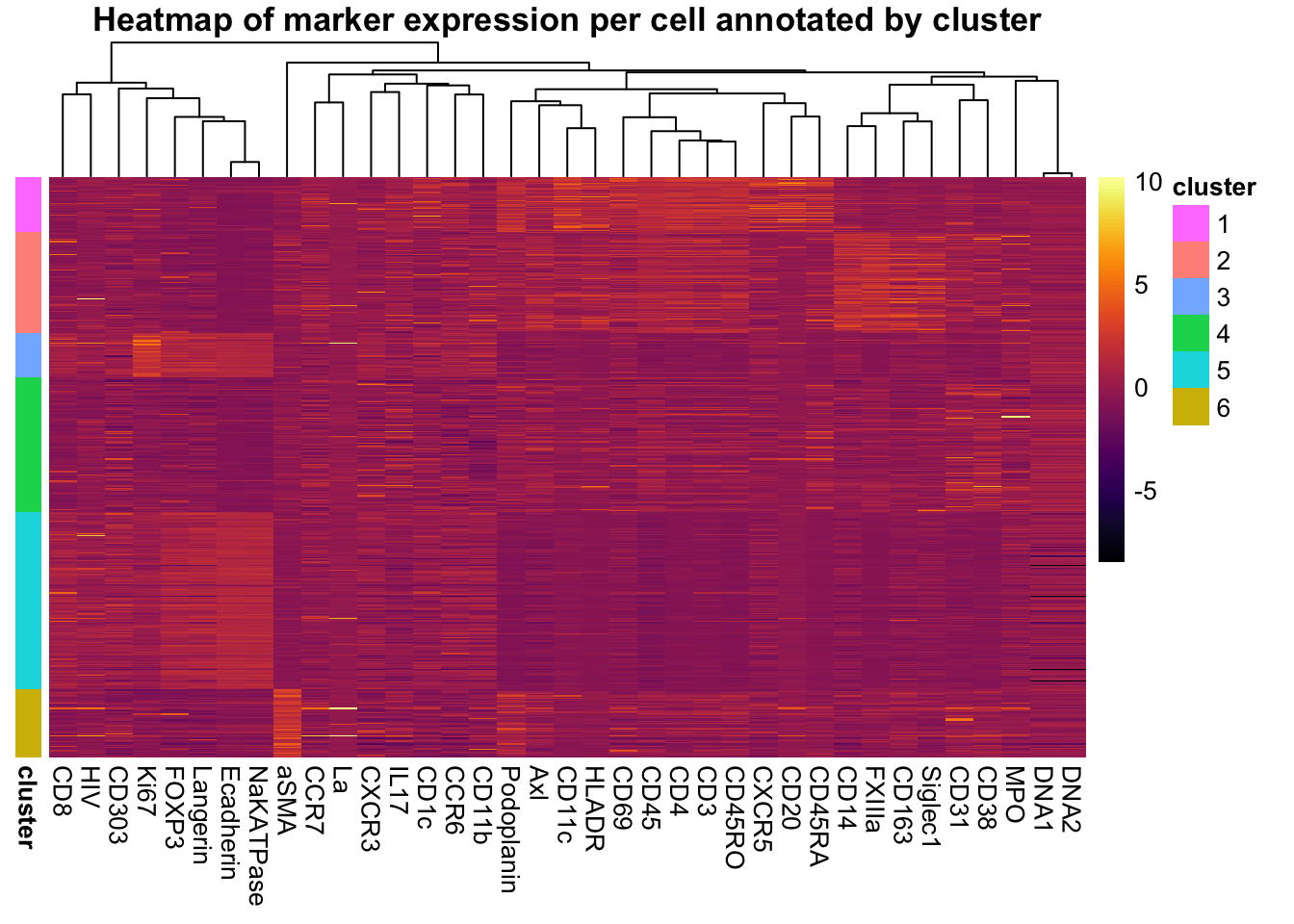 Heatmap of marker expression for each cell annotated by cluster.